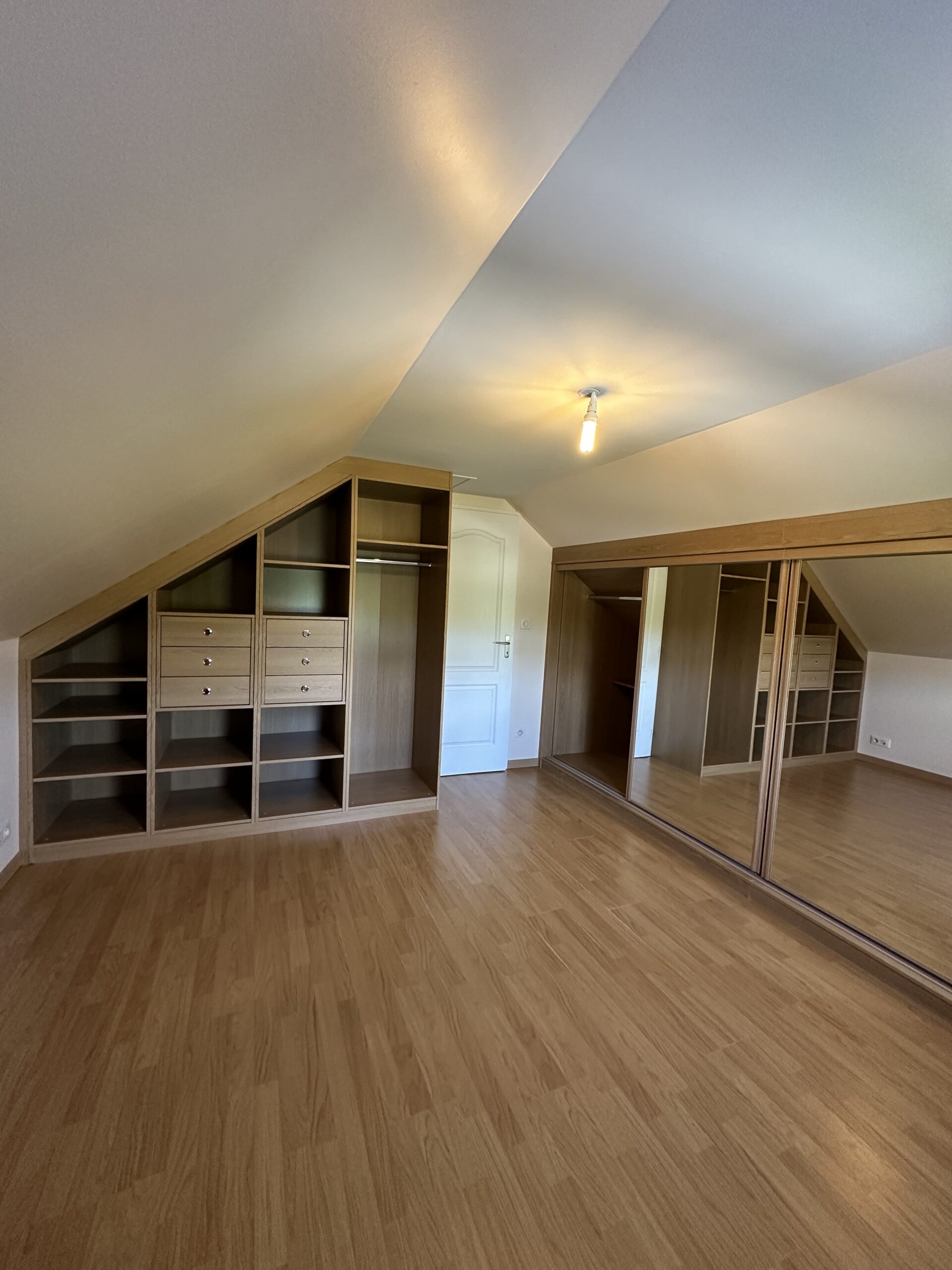 A l’étage: palier desservant 1 chambre, salle de bains + WC.